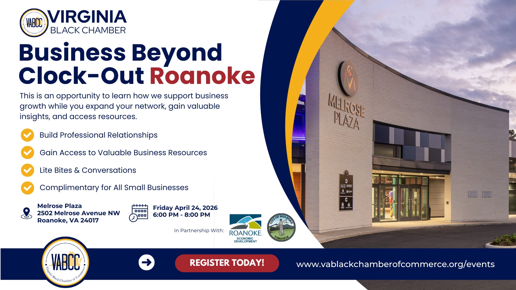 Join us for Business Beyond the Clock Out in Roanoke, an evening designed to help you learn how we support business growth while you expand your network, gain valuable insights, and access resources. This event focuses on relationship building and connecting you to the growing ecosystem of programs, partnerships, and opportunities the Chamber is building across Virginia to support Black-owned businesses. Whether you are just starting or ready to scale, this is an opportunity to get connected and plugged in.